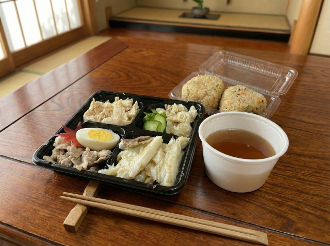 現在、供えられるウサンミには、豚肉、ミミガー(豚の耳)、白身魚、鶏肉などが盛り付けられています。ウサンミとともに添えられた三杯酢にゆで卵を溶き、その中にウサンミを浸して食べるのが特徴です。さらに、ジューシーのおにぎりが添えられるのも現在の久米村ならではの形です。