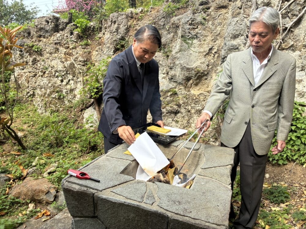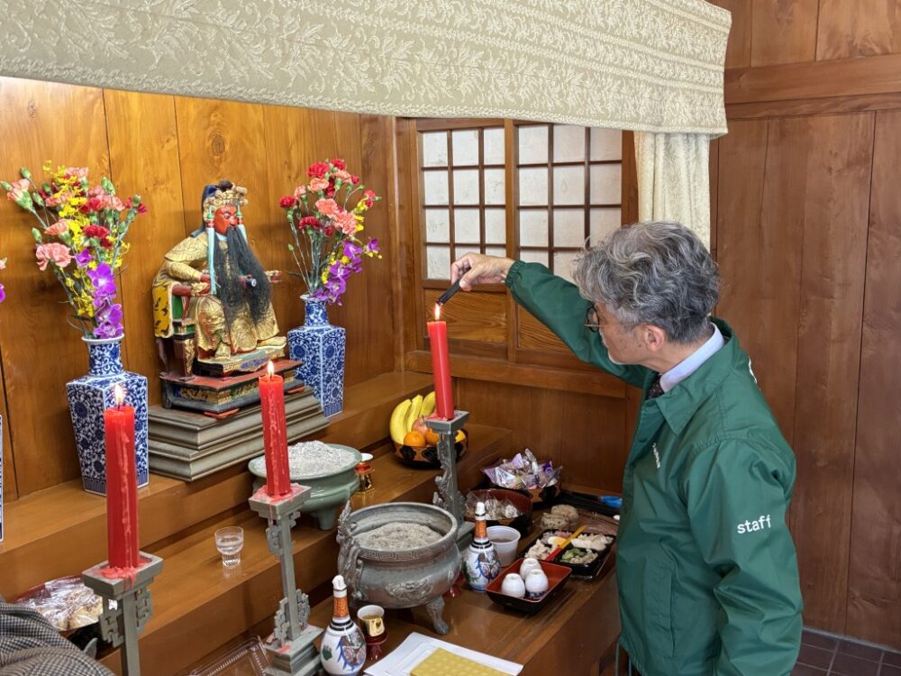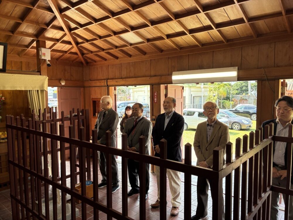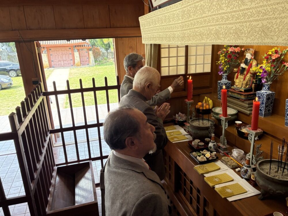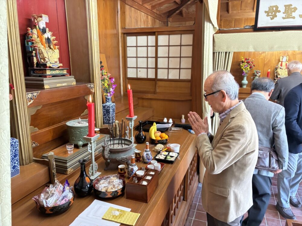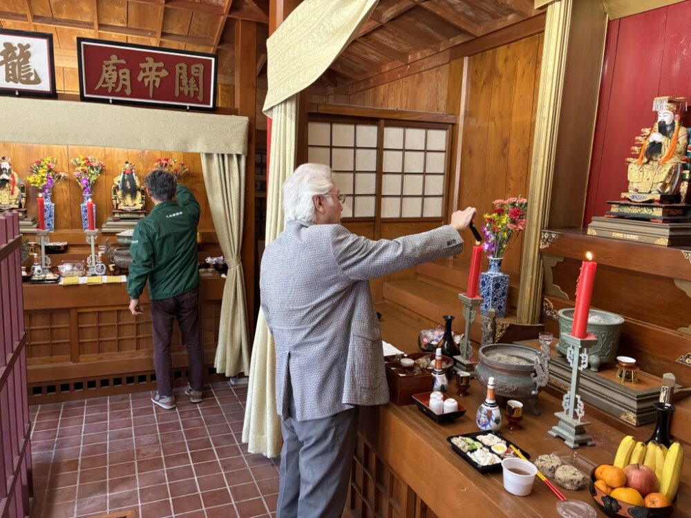 当日は久米崇聖会の理事・会員が参集し、天尊廟・天妃宮・関帝廟・龍王殿それぞれに線香を手向け、ウチカビ(打紙)を焚いて神々に捧げ、新年の平安と地域の繁栄を祈念しました。