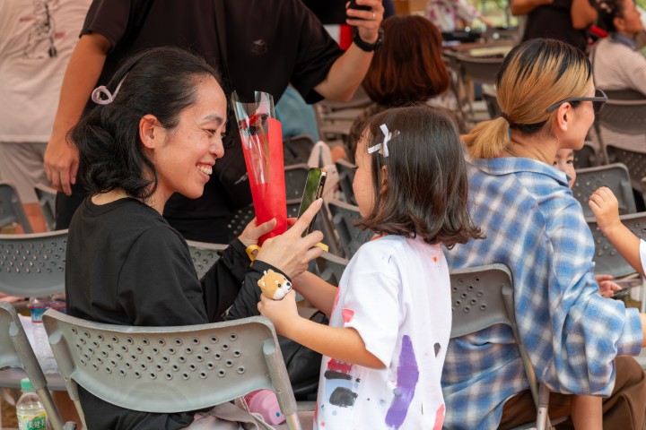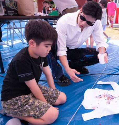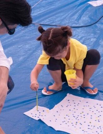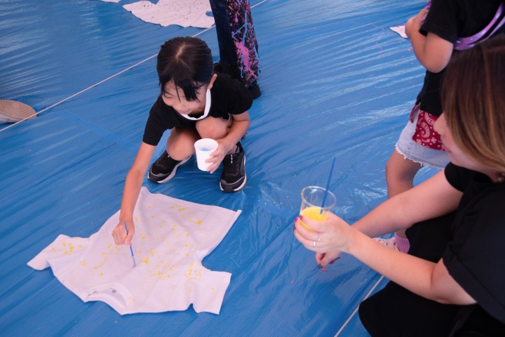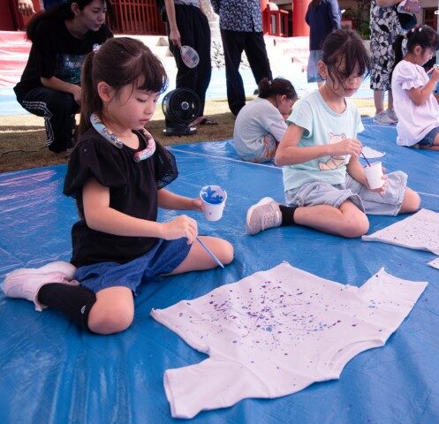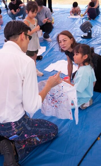 前日の九月二十七日にTシャツペイントのワークショップからスタートしました。参加した子どもたちは真っ白なシャツにカラフルな絵の具を思いきり飛ばし、世界にひとつだけのオリジナルTシャツを作り上げました。完成した作品はテント内にずらりと並び、まるで小さなアート展のような賑やかさとなりました。